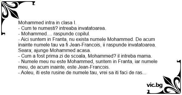 - Aici suntem in Franta, nu exista numele Mohammed. De acum inainte numele tau va fi Jean-Francois, ii raspunde invatatoarea.