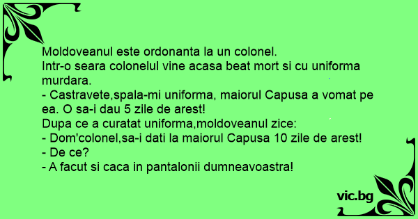 Moldoveanul este ordonanta la un colonel. Intr-o seara colonelul vine acasa beat mort si cu uniforma murdara. - Castravete,spala-mi uniforma, maiorul Capusa a vomat pe ea. O sa-i dau 5 zile de arest! Dupa ce a curatat uniforma,moldoveanul zice: - Dom'colonel,sa-i dati la maiorul Capusa 10 zile de arest! - De ce? - A facut si саса in pantalonii dumneavoastra!