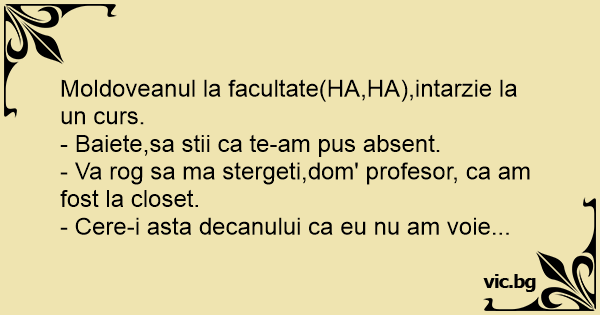 Moldoveanul la facultate(HA,HA),intarzie la un curs. - Baiete,sa stii ca te-am pus absent. - Va rog sa ma stergeti,dom' profesor, ca am fost la closet. - Cere-i asta decanului ca eu nu am voie...