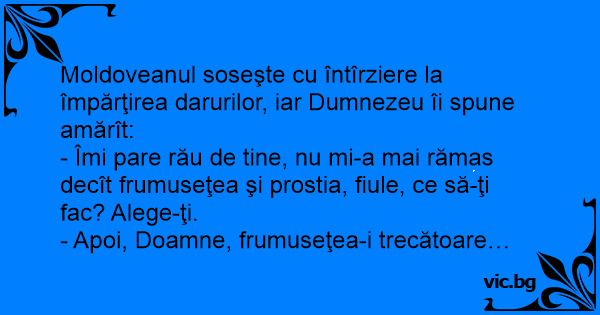 Moldoveanul soseşte cu întîrziere la împărţirea darurilor, iar Dumnezeu îi spune amărît: