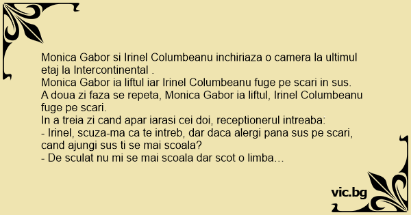 - Irinel, scuza-ma ca te intreb, dar daca alergi pana sus pe scari, cand ajungi sus ti se mai scoala?