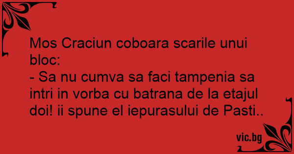 - Sa nu cumva sa faci tampenia sa intri in vorba cu batrana de la etajul doi! ii spune el iepurasului de Pasti..