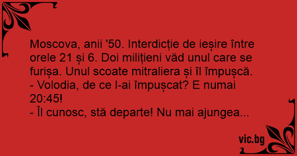 - Volodia, de ce l-ai împușcat? E numai 20:45!