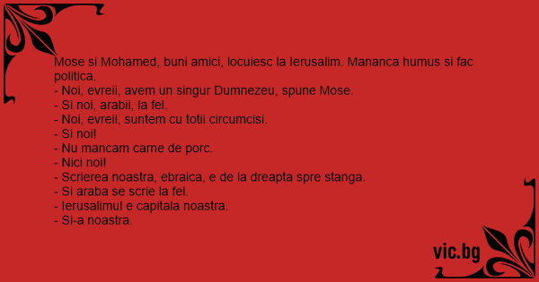 Mose si Mohamed, buni amici, locuiesc la Ierusalim. Mananca humus si fac politica.