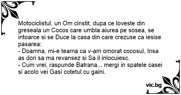 Motociclistul, un Om cinstit, dupa ce loveste din greseala un Cocos care umbla aiurea pe sosea, se intoarce si se Duce la casa din care crezuse ca iesise pasarea: