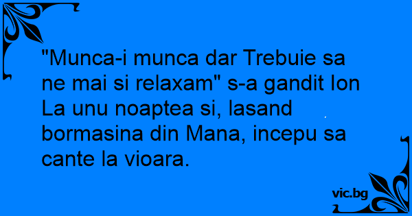 "Munca-i munca dar Trebuie sa ne mai si relaxam" s-a gandit Ion La unu noaptea si, lasand bormasina din Mana, incepu sa cante la vioara.