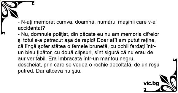 - N-aţi memorat cumva, doamnă, numărul maşinii care v-a accidentat?