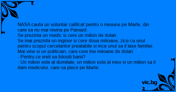 - Un milion este al dumitale, un milion este al meu si un milion sa il dam medicului, care sa plece pe Marte.