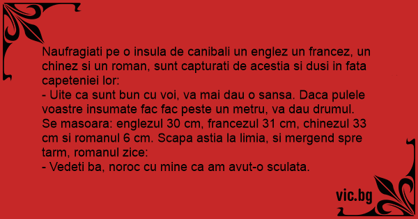 Se masoara: englezul 30 cm, francezul 31 cm, chinezul 33 cm si romanul 6 cm. Scapa astia la limia, si mergend spre tarm, romanul zice: