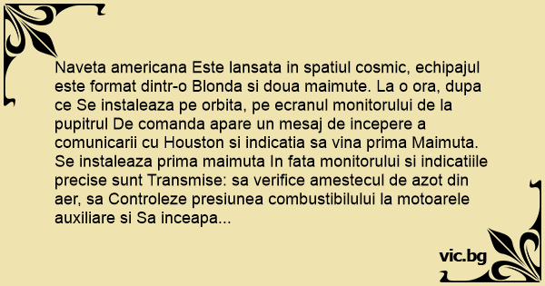 Naveta americana Este lansata in spatiul cosmic, echipajul este format dintr-o Blonda si doua maimute. La o ora, dupa ce Se instaleaza pe orbita, pe ecranul monitorului de la pupitrul De comanda apare un mesaj de incepere a comunicarii cu Houston si indicatia sa vina prima Maimuta.