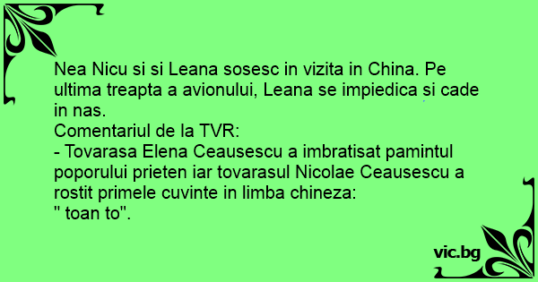- Tovarasa Elena Ceausescu a imbratisat pamintul poporului prieten iar tovarasul Nicolae Ceausescu a rostit primele cuvinte in limba chineza: