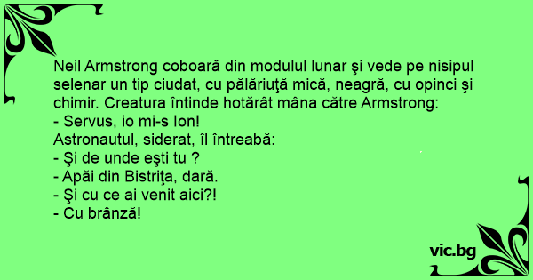 Neil Armstrong coboară din modulul lunar şi vede pe nisipul selenar un tip ciudat, cu pălăriuţă mică, neagră, cu opinci şi chimir. Creatura întinde hotărât mâna către Armstrong: