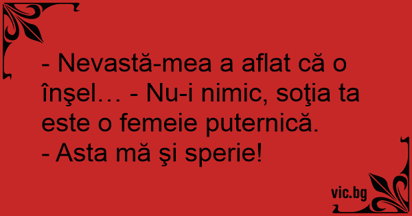- Nevastă-mea a aflat că o înşel… - Nu-i nimic, soţia ta este o femeie puternică.