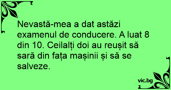 Nevastă-mea a dat astăzi examenul de conducere. A luat 8 din 10. Ceilalți doi au reușit să sară din fața mașinii și să se salveze.