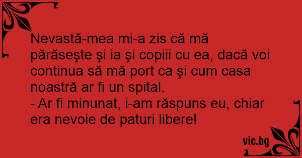 Nevastă-mea mi-a zis că mă părăseşte şi ia şi copiii cu ea, dacă voi continua să mă port ca şi сuм casa noastră ar fi un spital.