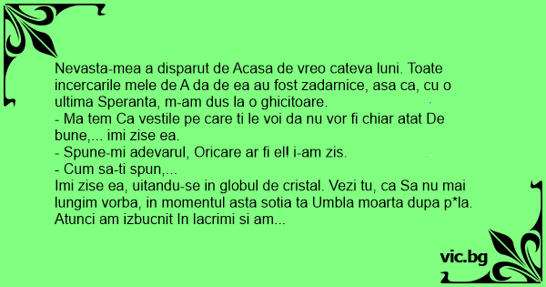 Imi zise ea, uitandu-se in globul de cristal. Vezi tu, ca Sa nu mai lungim vorba, in momentul asta sotia ta Umbla moarta dupa p*la.