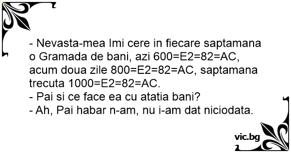 - Nevasta-mea Imi cere in fiecare saptamana o Gramada de bani, azi 600=E2=82=AC, acum doua zile 800=E2=82=AC, saptamana trecuta 1000=E2=82=AC.