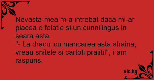 Nevasta-mea m-a intrebat daca mi-ar placea o felatie si un сunnilingus in seara asta.