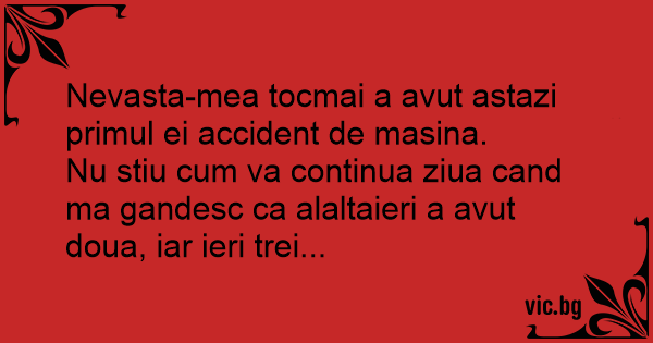 Nevasta-mea tocmai a avut astazi primul ei accident de masina.