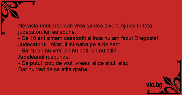 Nevasta unui ardelean vrea sa dea divort. Ajunsi In fata judecatorului, ea spune: