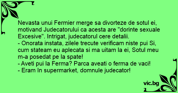 Nevasta unui Fermier merge sa divorteze de sotul ei, motivand Judecatorului ca acesta are "dorinte sexuale Excesive". Intrigat, judecatorul cere detalii.