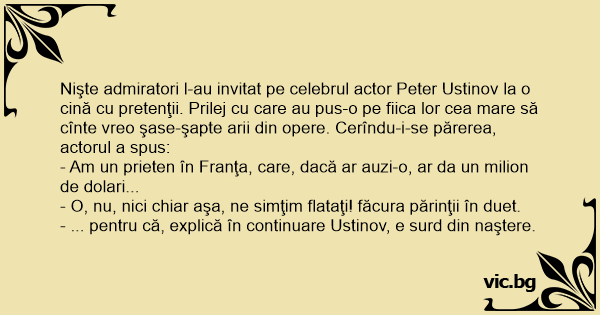 Nişte admiratori l-au invitat pe celebrul actor Peter Ustinov la o cină cu pretenţii. Prilej cu care au pus-o pe fiica lor cea mare să cînte vreo şase-şapte arii din opere. Cerîndu-i-se părerea, actorul a spus: