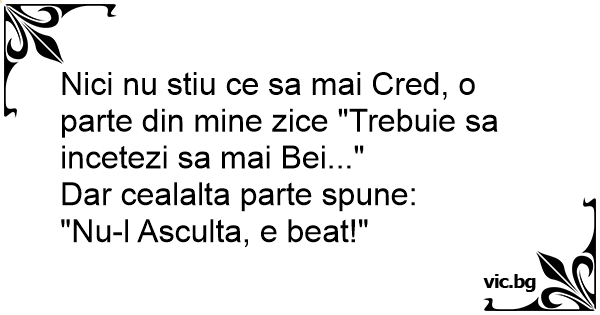 Nici nu stiu ce sa mai Cred, o parte din mine zice "Trebuie sa incetezi sa mai Bei..."