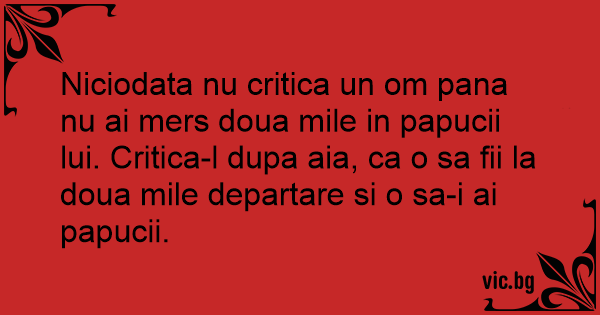 Niciodata nu critica un om pana nu ai mers doua mile in papucii lui. Critica-l dupa aia, ca o sa fii la doua mile departare si o sa-i ai papucii.