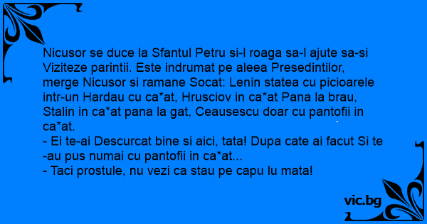 Nicusor se duce la Sfantul Petru si-l roaga sa-l ajute sa-si Viziteze parintii. Este indrumat pe aleea Presedintilor, merge Nicusor si ramane Socat: Lenin statea cu picioarele intr-un Hardau cu ca*at, Hrusciov in ca*at Pana la brau, Stalin in ca*at pana la gat, Ceausescu doar cu pantofii in ca*at.