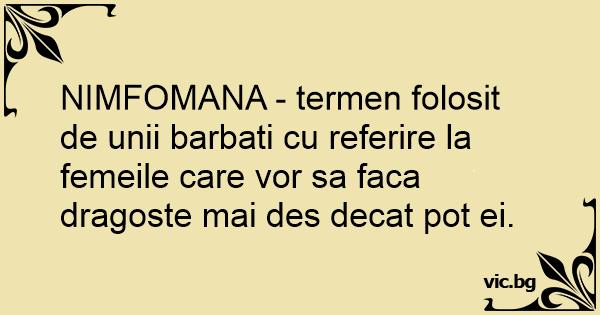 NIMFOMANA - termen folosit de unii barbati cu referire la femeile care vor sa faca dragoste mai des decat рот ei.