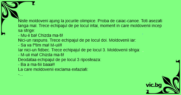 Niste moldoveni ajung la jocurile olimpice. Proba de caiac-canoe. Toti asezati langa mal. Trece echipajul de pe locul intai, moment in care moldovenii incep sa strige: