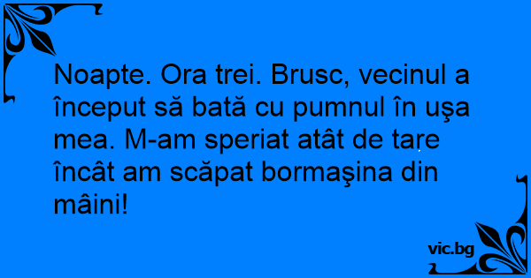 Noapte. Ora trei. Brusc, vecinul a început să bată cu pumnul în uşa mea. M-am speriat atât de tare încât am scăpat bormaşina din mâini!