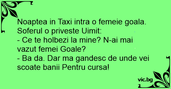 Beszáll a taxiba egy teljesen meztelen nő. A taxis tágra meredt szemekkel bámulja. A nő egy idő után megunja, és rászól: - Mi van? Nem látott még pucér nőt? - Azt már láttam, csak arra vagyok...