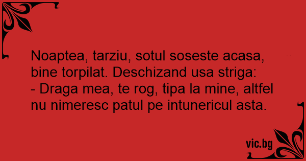 - Draga mea, te rog, tipa la mine, altfel nu nimeresc patul pe intunericul asta.