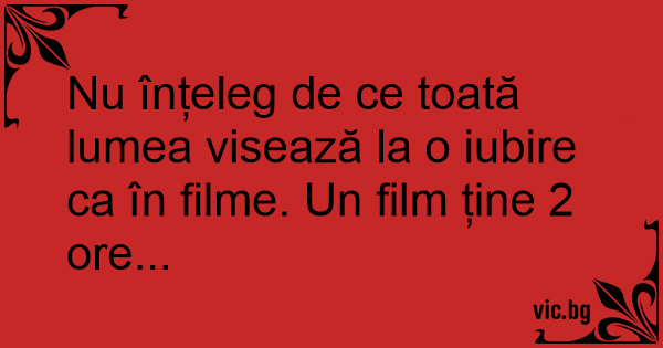 Nu înțeleg de ce toată lumea visează la o iubire ca în filme. Un film ține 2 ore...