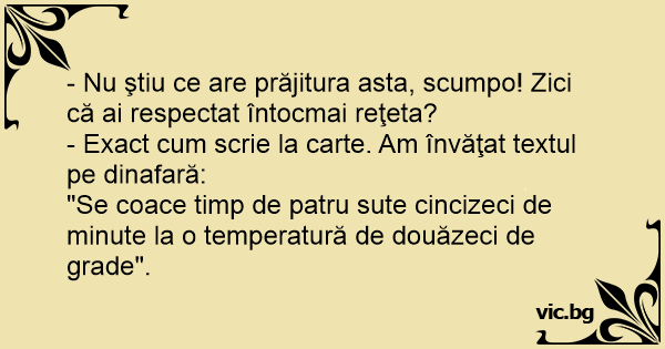 - Nu ştiu ce are prăjitura asta, scumpo! Zici că ai respectat întocmai reţeta?