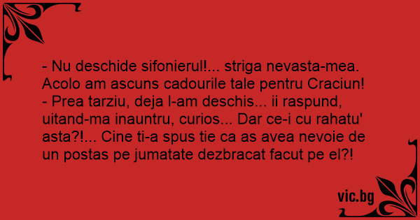 - Nu deschide sifonierul!... striga nevasta-mea. Acolo am ascuns cadourile tale pentru Craciun!