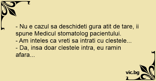 - Nu e cazul sa deschideti gura atit de tare, ii spune Medicul stomatolog pacientului.