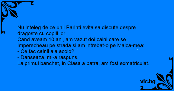 Cand aveam 10 ani, am vazut doi caini care se Imperecheau pe strada si am intrebat-o pe Maica-mea: