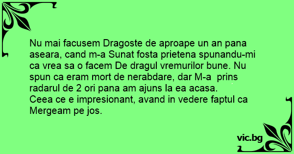 Nu mai facusem Dragoste de aproape un an pana aseara, cand m-a Sunat fosta prietena spunandu-mi ca vrea sa o facem De dragul vremurilor bune. Nu spun ca eram mort de nerabdare, dar M-a prins radarul de 2 ori pana am ajuns la ea acasa.