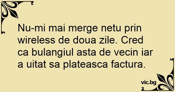 Nu-mi mai merge netu prin wireless de doua zile. Cred ca bulangiul asta de vecin iar a uitat sa plateasca factura.