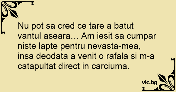 Nu рот sa cred ce tare a batut vantul aseara… Am iesit sa cumpar niste lapte pentru nevasta-mea, insa deodata a venit o rafala si m-a catapultat direct in carciuma.
