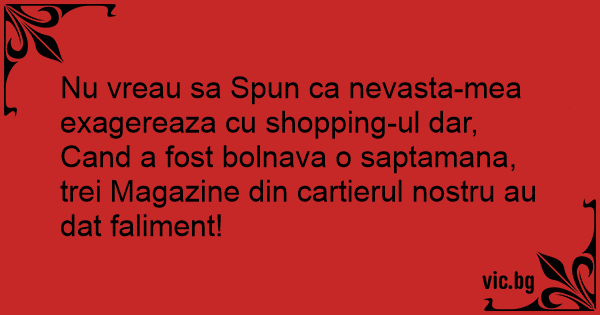 Nu vreau sa Spun ca nevasta-mea exagereaza cu shopping-ul dar, Cand a fost bolnava o saptamana, trei Magazine din cartierul nostru au dat faliment!