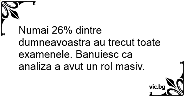 Numai 26% dintre dumneavoastra au trecut toate examenele. Banuiesc ca analiza a avut un rol masiv. 41 0 0 Perle amuzante