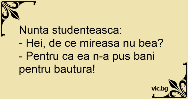 Nunta studenteasca:- Hei, de ce mireasa nu bea?- Pentru ca ea n-a pus bani pentru bautura! 61 0 0 Bancuri cu studenți Glume despre Bani