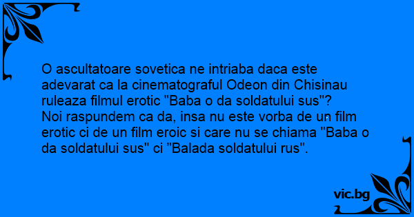O ascultatoare sovetica ne intriaba daca este adevarat ca la cinematograful Odeon din Chisinau ruleaza filmul еrотiс "Baba o da soldatului sus"?