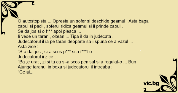 O autostopista ... Opresta un sofer si deschide geamul . Asta baga capul si pac! , soferul ridica geamul si ii prinde capul .