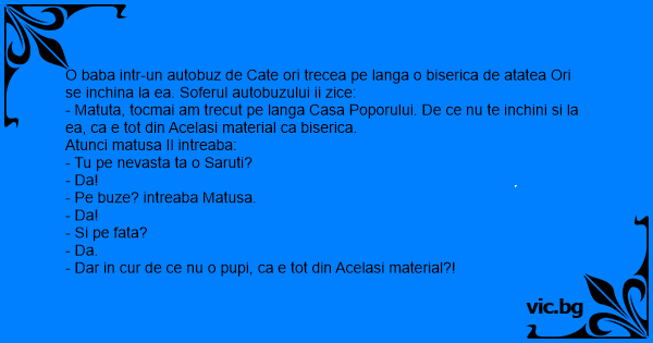 O baba intr-un autobuz de Cate ori trecea pe langa o biserica de atatea Ori se inchina la ea. Soferul autobuzului ii zice: