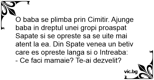 O baba se plimba prin Cimitir. Ajunge baba in dreptul unei gropi proaspat Sapate si se opreste sa se uite mai atent la ea. Din Spate venea un betiv care es opreste langa si o Intreaba: