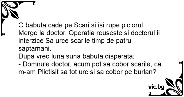 - Domnule doctor, acum рот sa cobor scarile, ca m-am Plictisit sa tot urc si sa cobor pe burlan?
